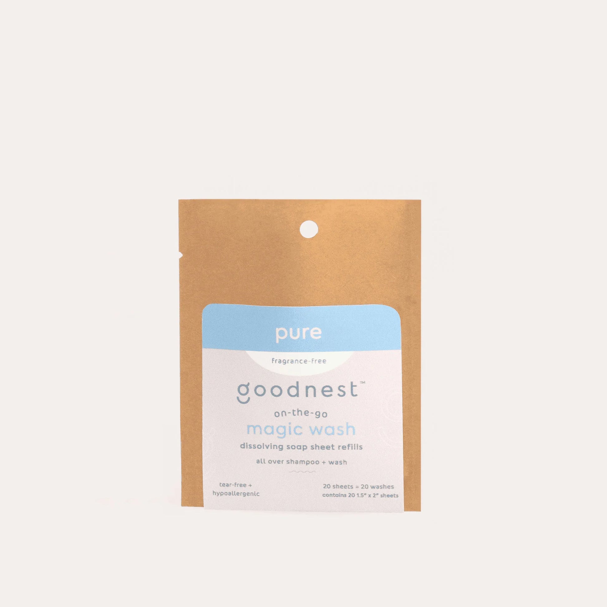 Embrace the magic of bathtime with our travel-friendly Magic Wash soap sheets. Designed for on-the-go ease, simply dissolve a sheet to create suds for a soothing bath, wherever you and your little one may be. Suitable for babies and toddlers, use up to two sheets per bath to cleanse hair and body.